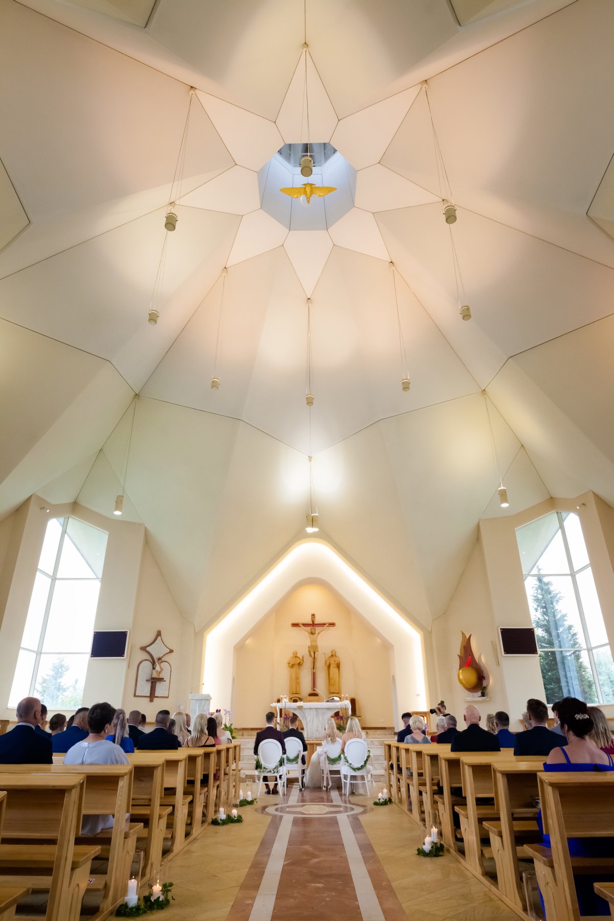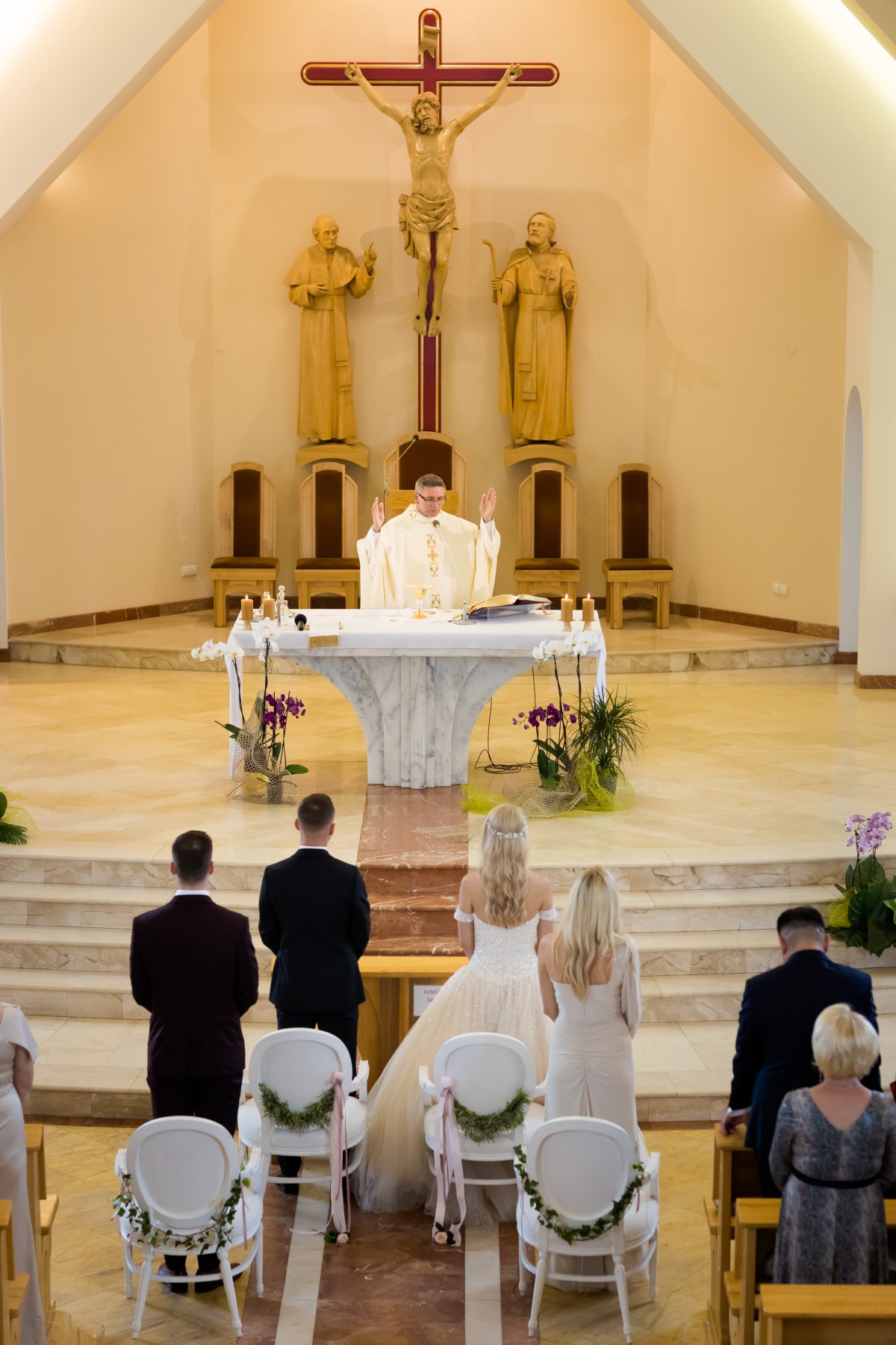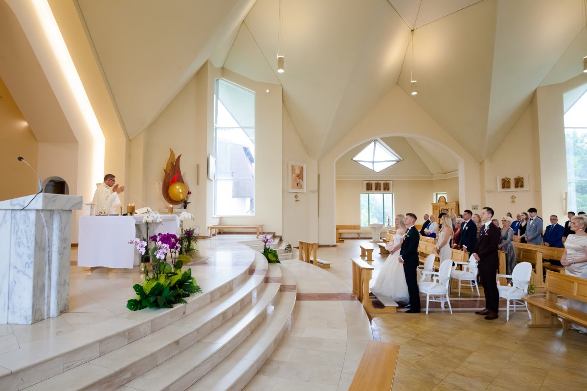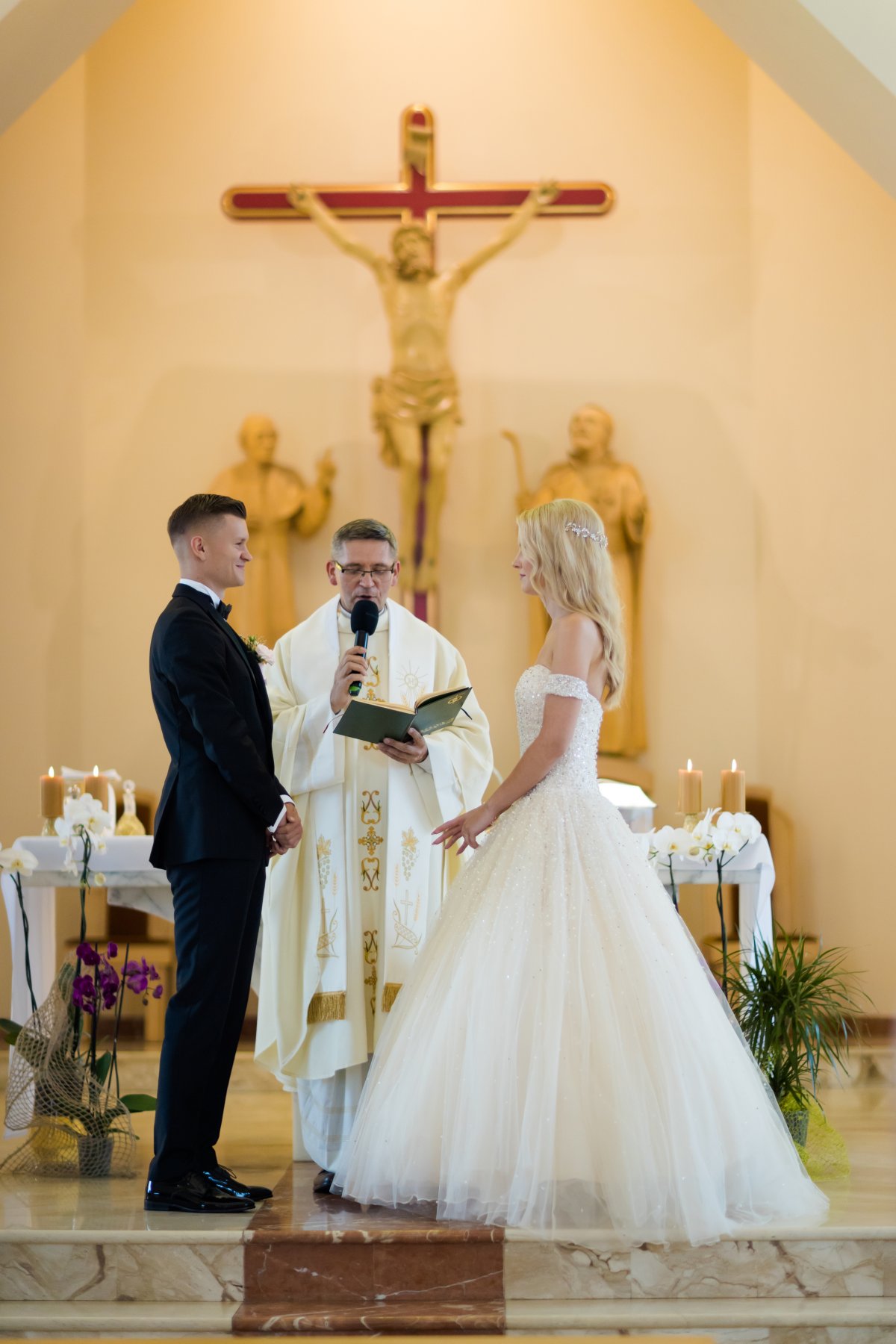 Daria i Konrad powiedzieli sobie TAK w parafii Andrzeja Boboli w Bielsku. Nowoczesny, przestronny kościół idealnie wpasował się w elegancką oprawę całego dnia.