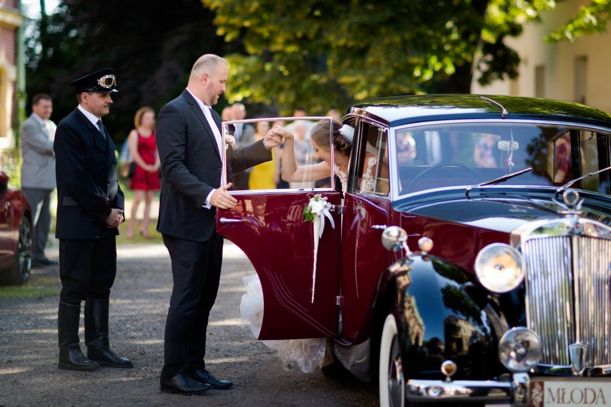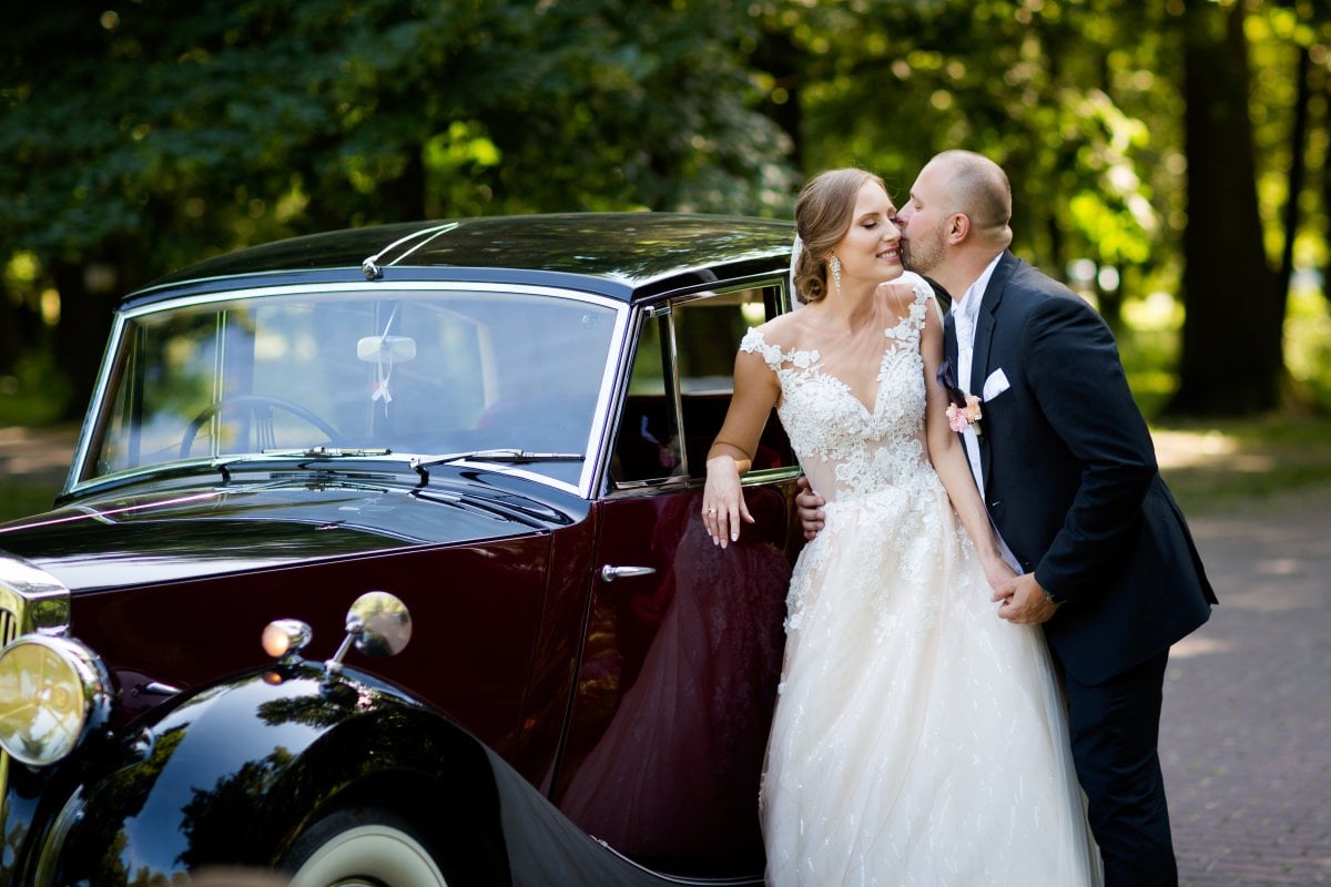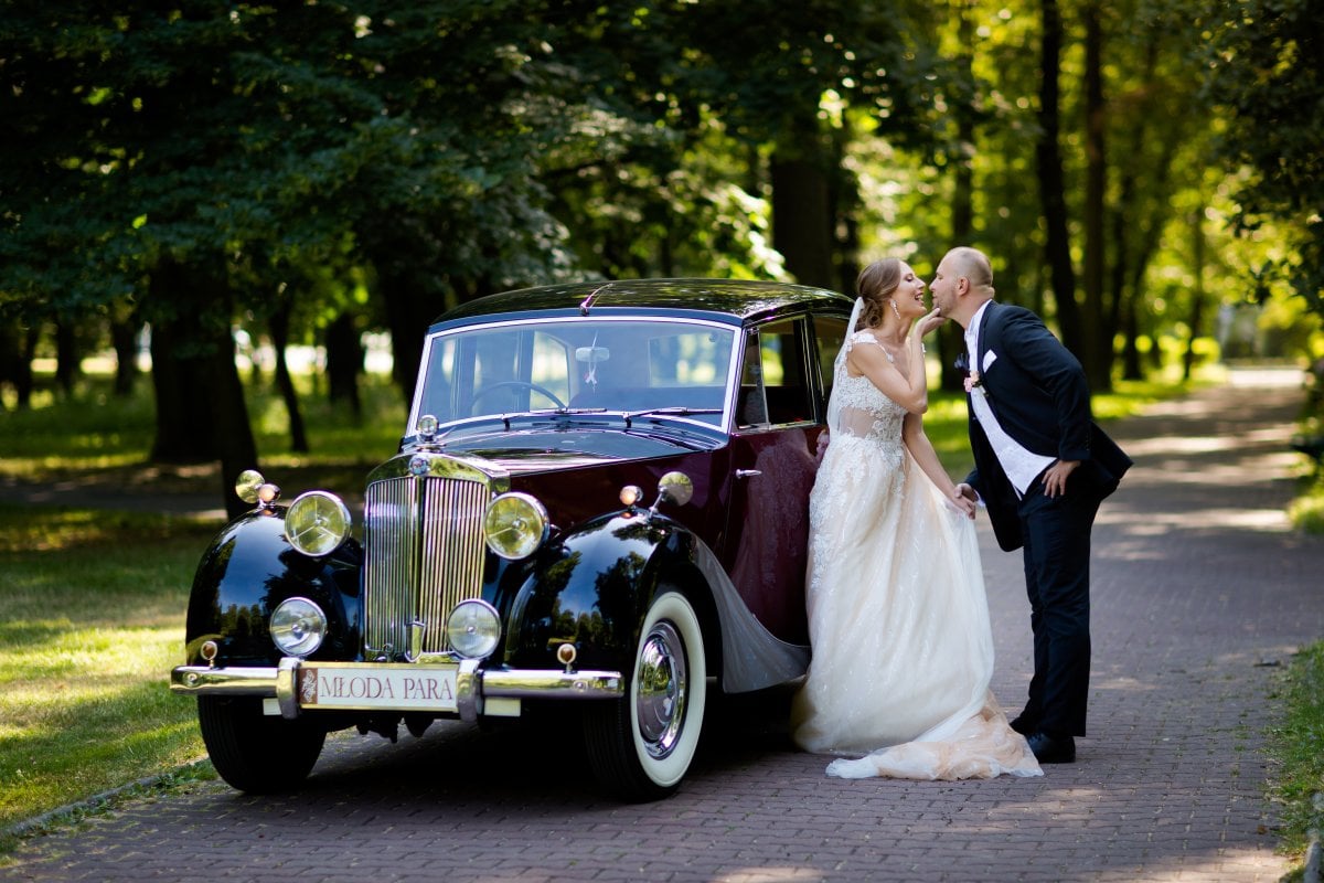 Na pewno zwrócicie też uwagę na zabytkowy samochód, którym poruszała się Para Młoda (a skoro już tak było, to dlaczego nie wykorzystać takiego cuda do zdjęć? 🙂 ). Wspaniałe autko i kierowca z klasą, który z ogromną pasją opowiada o nim zaciekawiając tym wszystkich słuchających (to pewnie dlatego część gości znikała na początku wesela 😉 ).