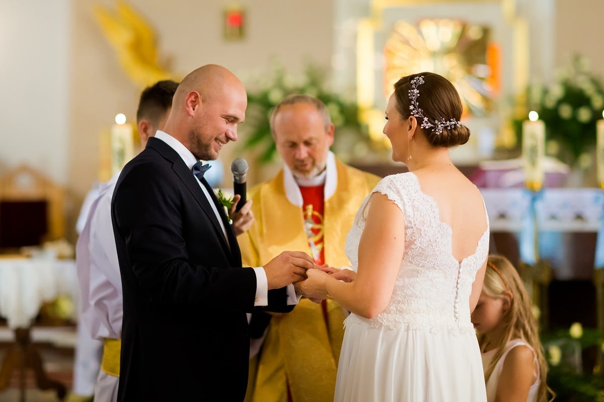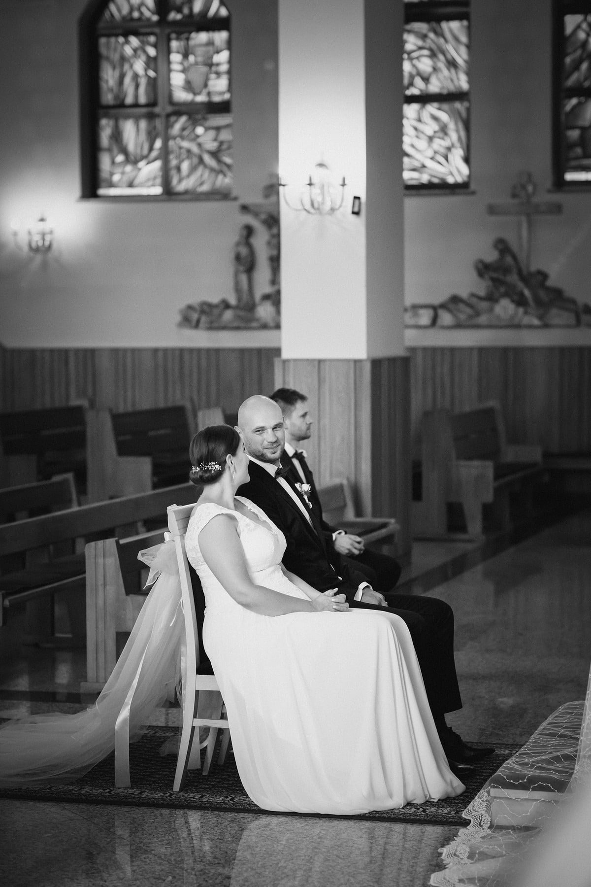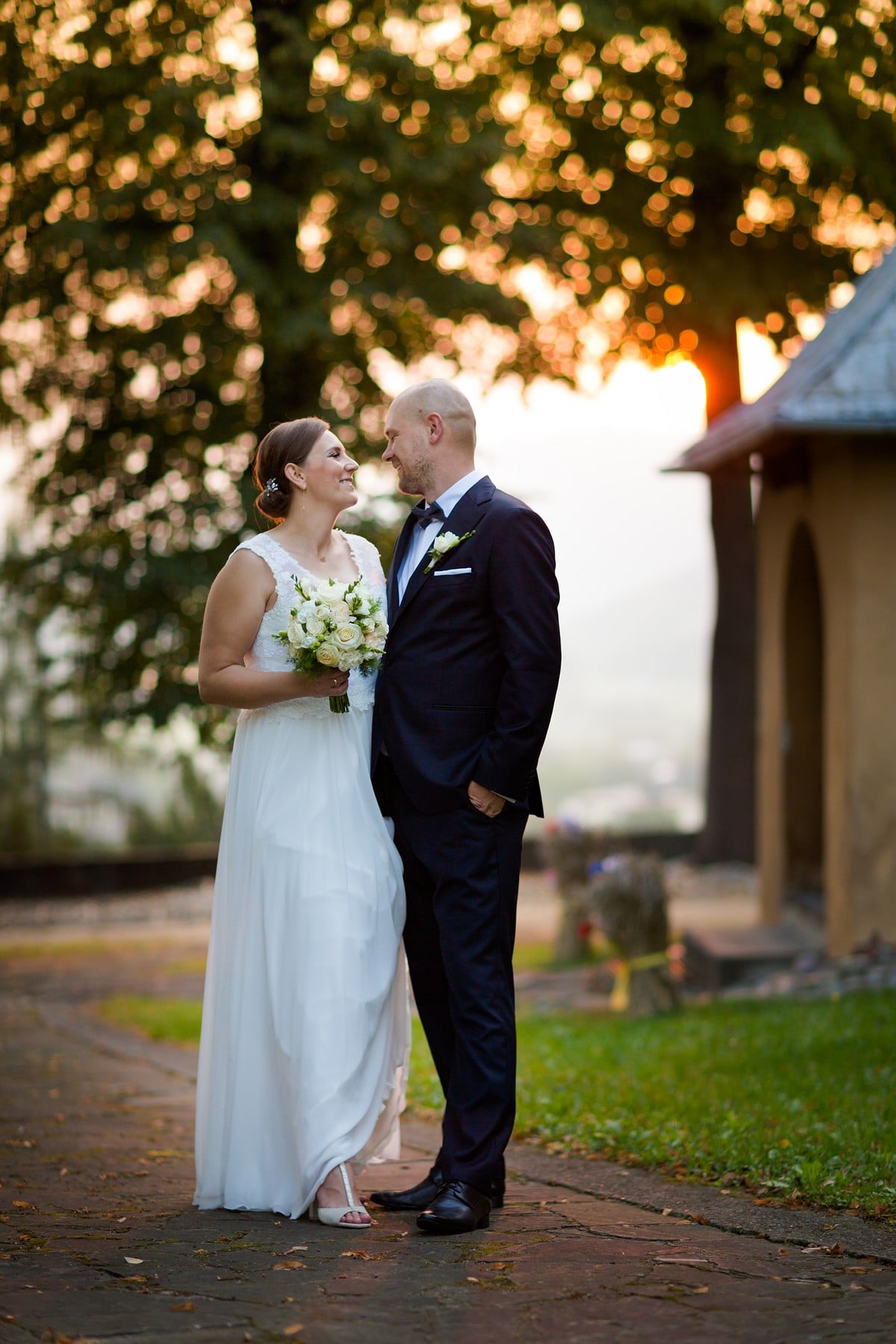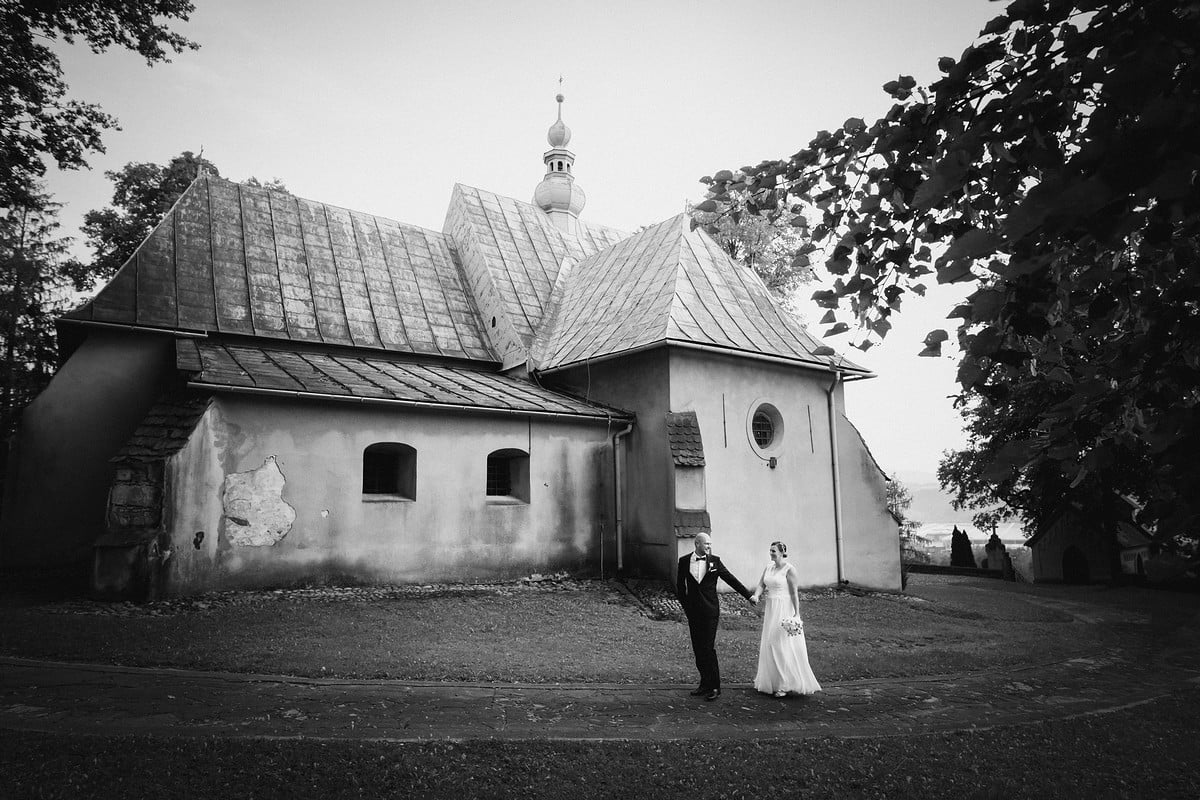 Bardzo lubimy, gdy na sesje ślubne udajemy się w miejsca dla nas jak dotąd nieznane, w miejsca bliskie Wam. Tak też było tym razem – wybraliśmy się w okolice przepięknego zabytkowego kościółka na wzgórzu z widokiem na okolicę. Zachodzące słońce było wymarzoną scenerią do zdjęć, a Monika z Danielem mogli chwilę odetchnąć, pospacerować, nacieszyć się sobą przed dalszą szaloną zabawą weselną.