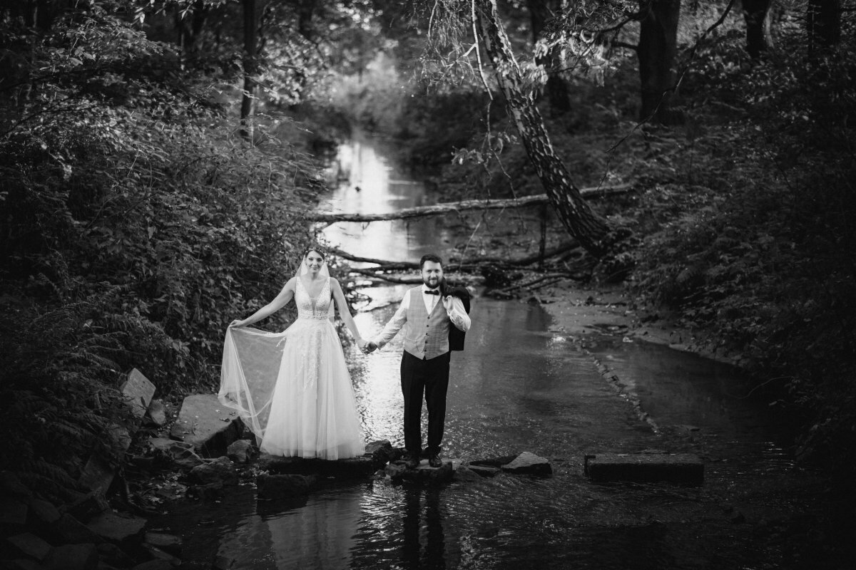 Wrzesień to ostatni czas, kiedy można się załapać na zdjęciach zarówno na barwy lata, jak i jesieni. Cudne odcienie złota zawsze wyglądają bajkowo. Zmysłowa sukienka i welon Klaudii wyglądały przepięknie oświetlone delikatnymi promieniami słońca. Bardzo się też cieszymy, że jeszcze się nam udało złapać nieco lata, bo trochę soczystej zieleni zawsze wprowadza świeżość do efektu końcowego, powiewu radości i młodości.