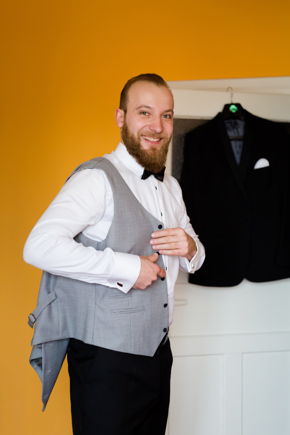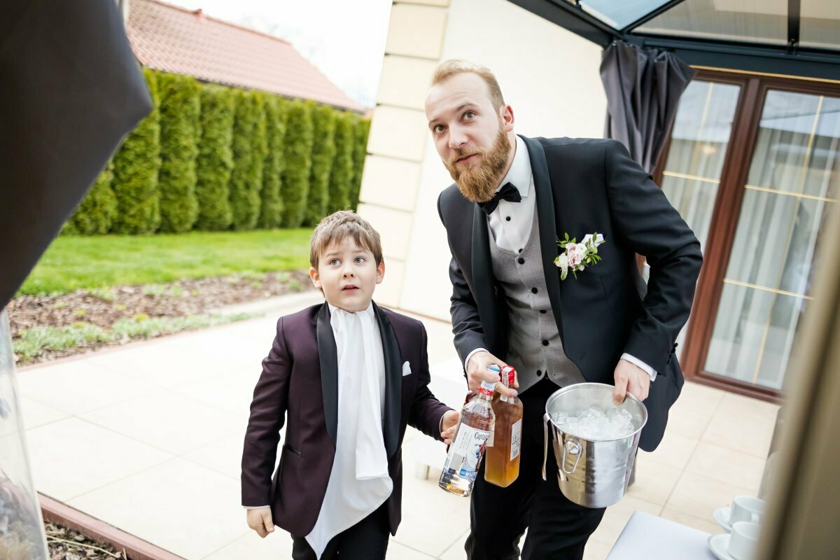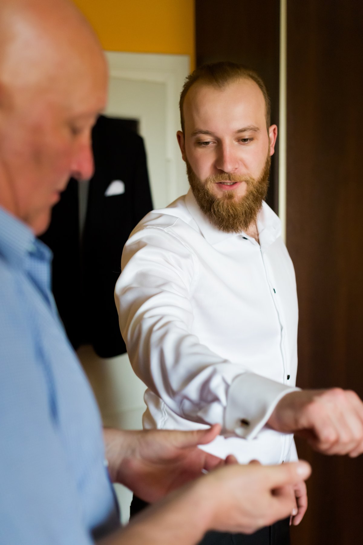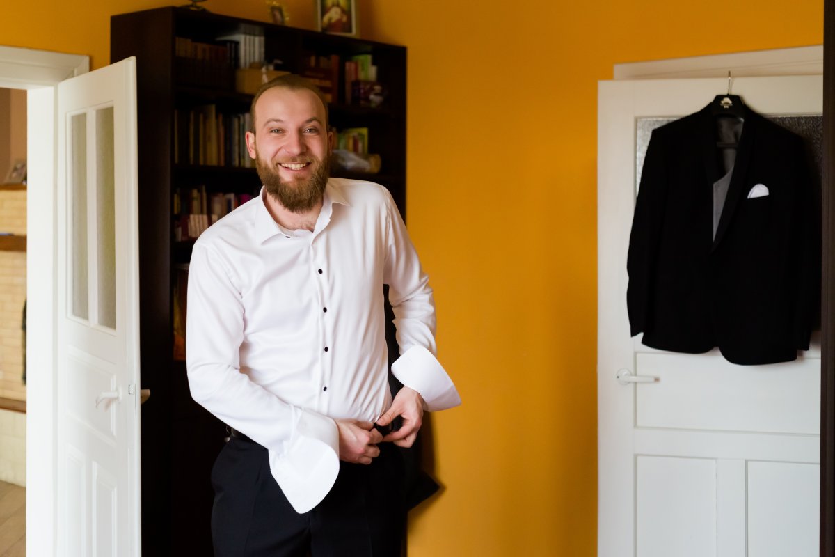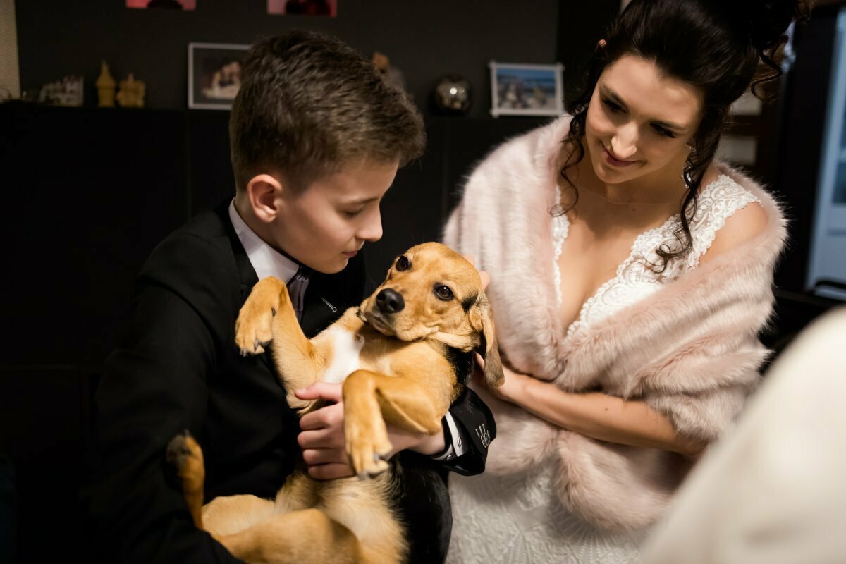 Na początku reportażu na pewno zwrócicie uwagę na rozkoszne czworonogi, które pojawiły się na przygotowaniach(a jednego łakomczucha znajdziecie też na przyjęciu weselnym!). Musimy przyznać – mamy słabość do zwierząt. Piesków, kotków, chomików… fajnie gdy są z Wami w tym dniu! Basia spokojnie przygotowywała się w domu, w towarzystwie innych Pań oraz pod czujnym okiem brata i słodkiego psiaka. Panowie natomiast udali się do barbera. Bo przecież Pan Młody również ma swoje przygotowania i choć czasem wydaje się Wam, że nic szczególnego się tam nie dzieje.. to oj dzieje się! Zobaczcie sami na zdjęciach poniżej 🙂