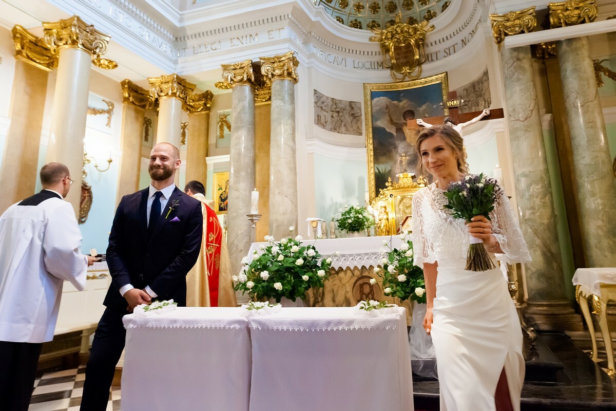 Na koniec zwrócimy jeszcze uwagę na cudne fioletowe dodatki oraz dopasowany, lawendowy makijaż Panny Młodej, który wykonała Honorata Pawlak. Co do wybranej sukni ślubnej oraz figury Justyny – tutaj mamy jedno słowo – idealne. Oczywiście Piotr również świetnie się prezentował w klasycznym garniturze. Na dodatek tuż przed ślubem zabrał przyszłą małżonkę na przejażdżkę klimatyczną Skodą ulicami Krakowa!